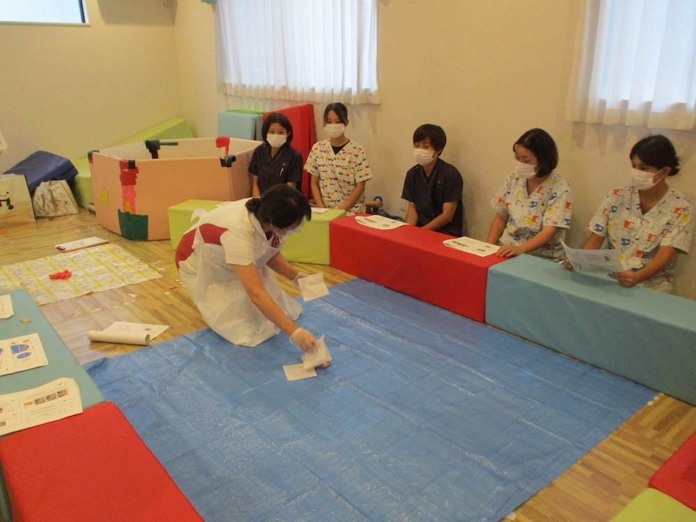 看護師さんには感染対策として嘔吐物処理についての講義をしていただきました。